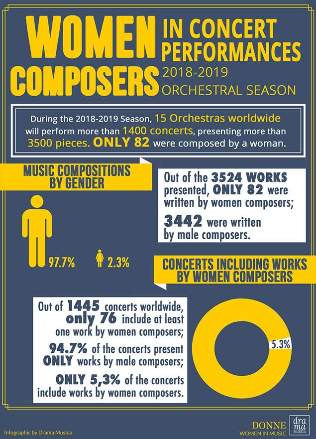 Research by independent classical label Drama Musica has revealed that of the concerts it surveyed, 1,368 (94.7 percent) will only feature works by male composers, while just 76 (5.3 percent) will include works written by women.